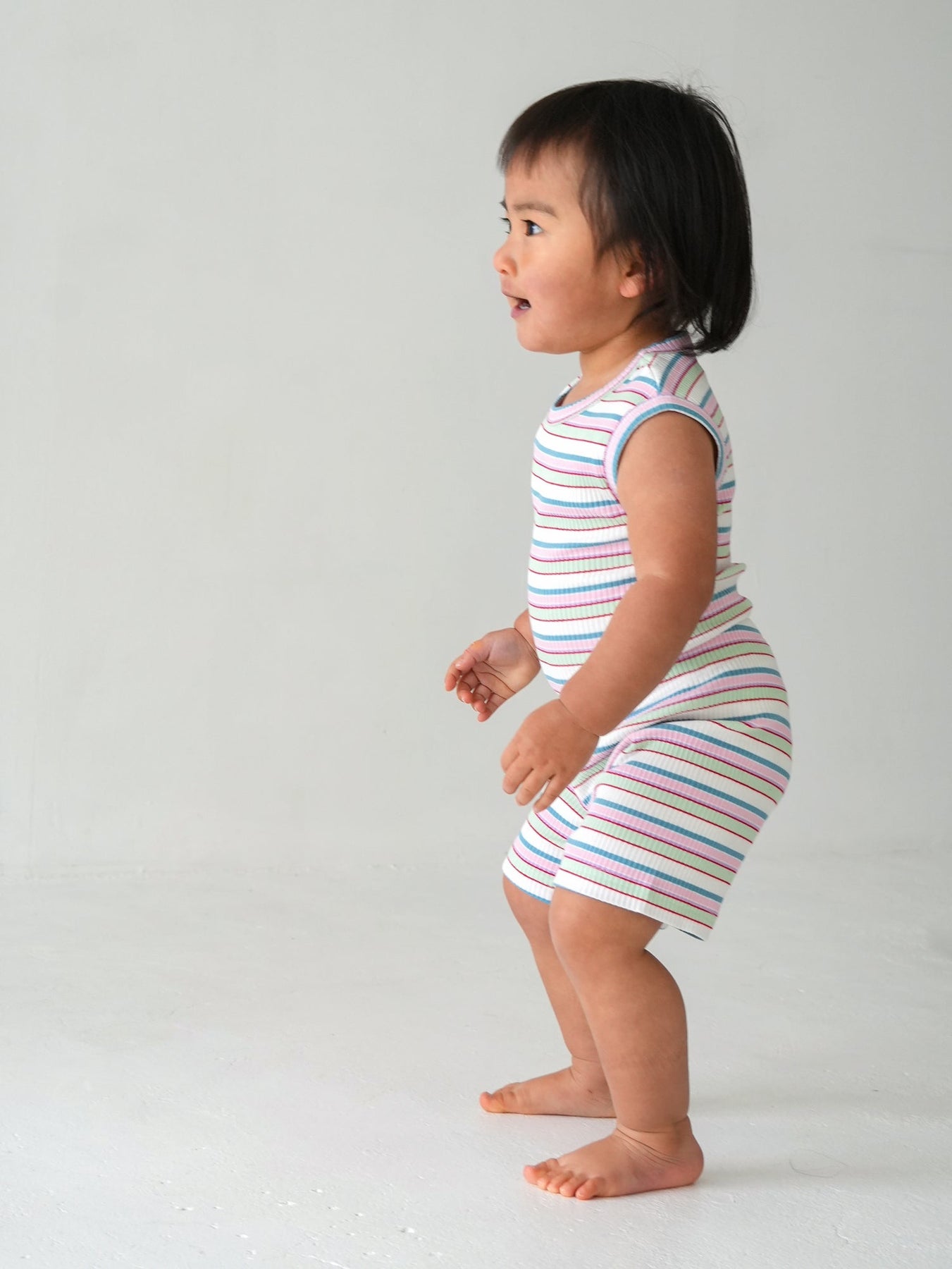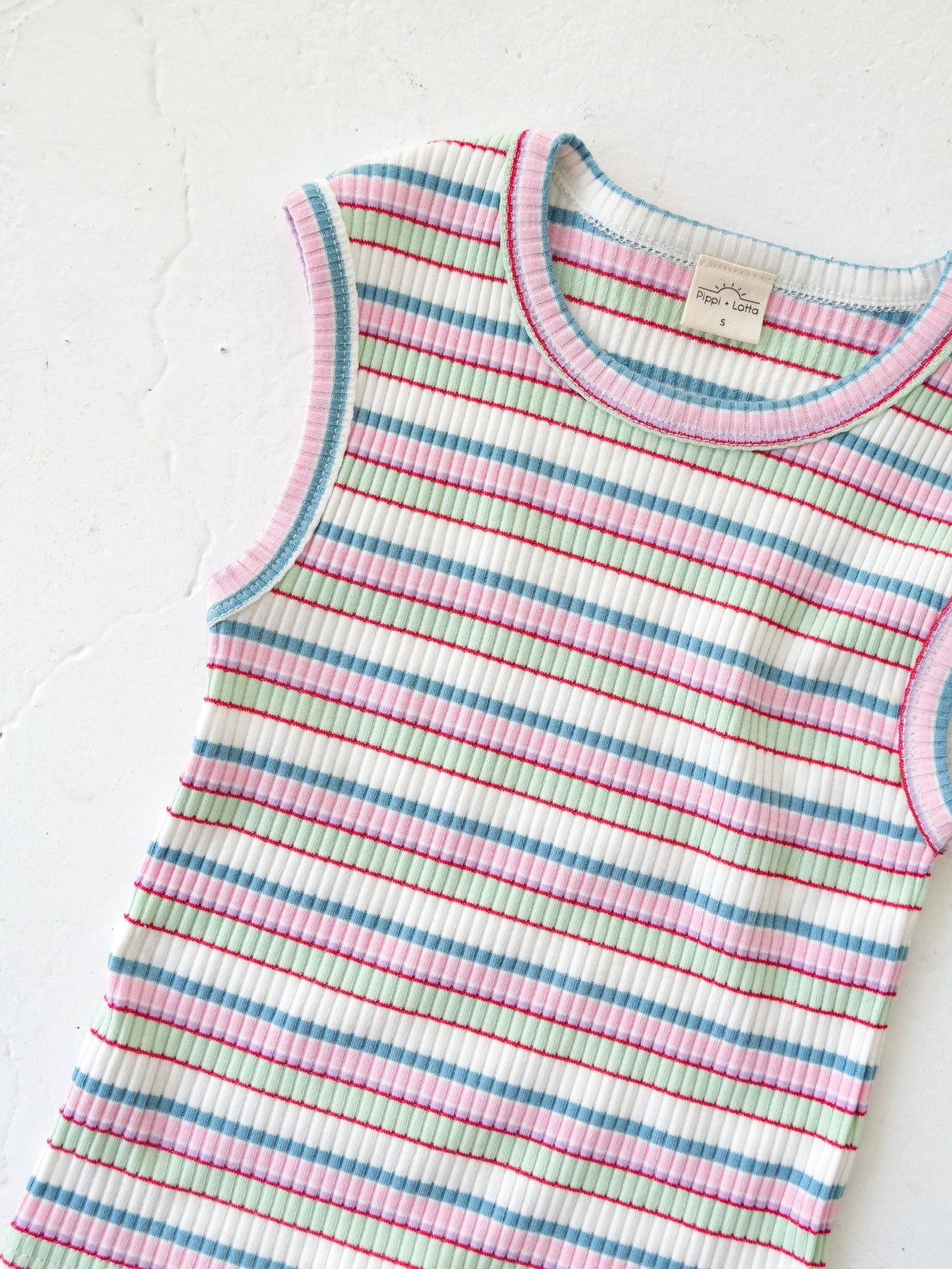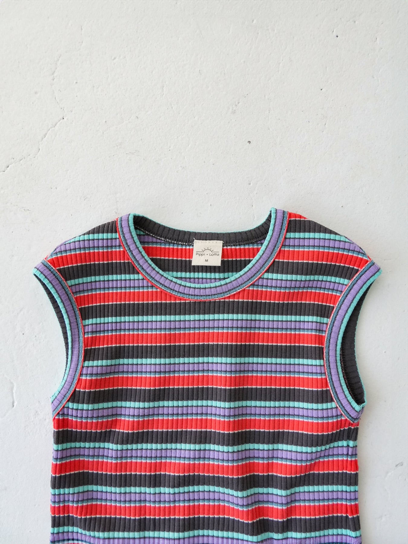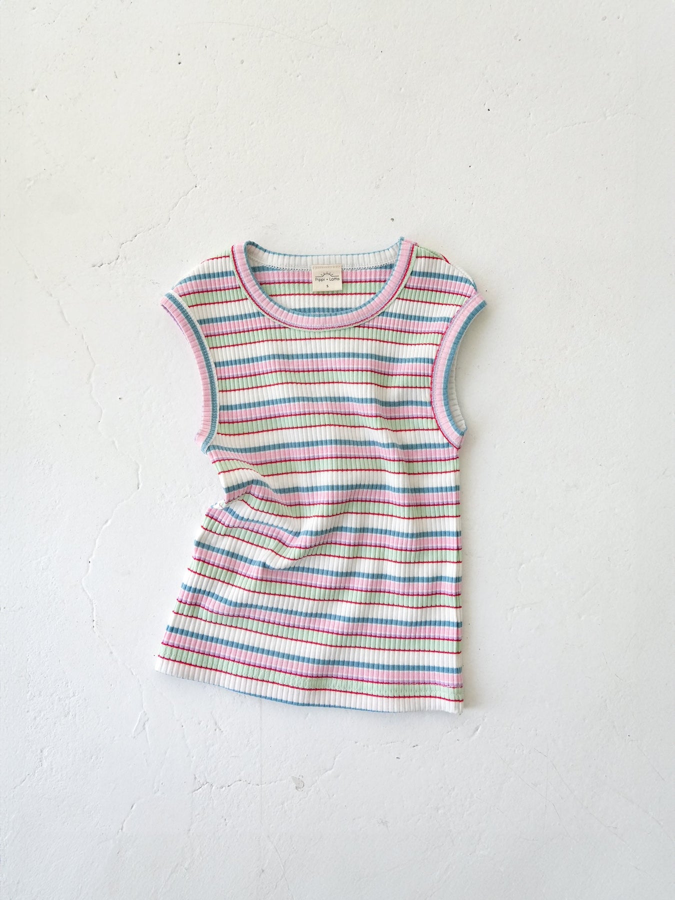 明るくポップな配色が目を引く、マルチストライプ柄のノースリーブトップス。夏らしい軽やかなデザインで、コーディネートの主役になる一枚です。
