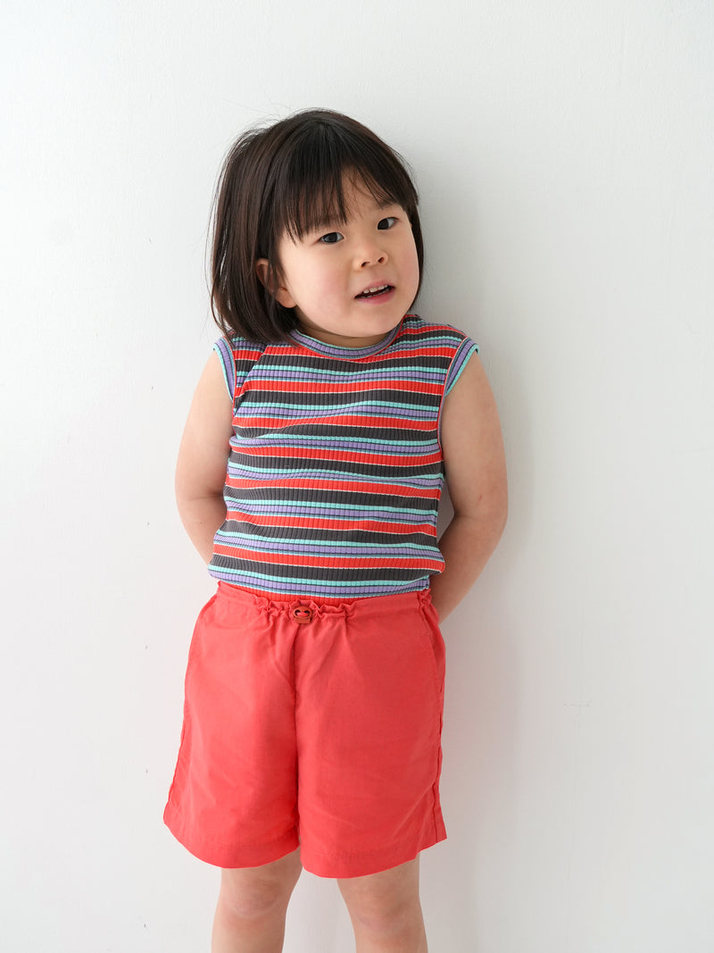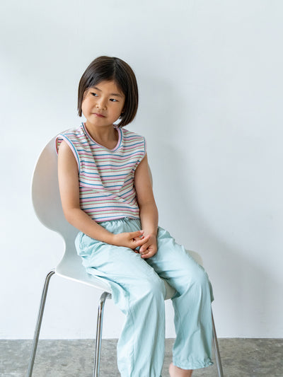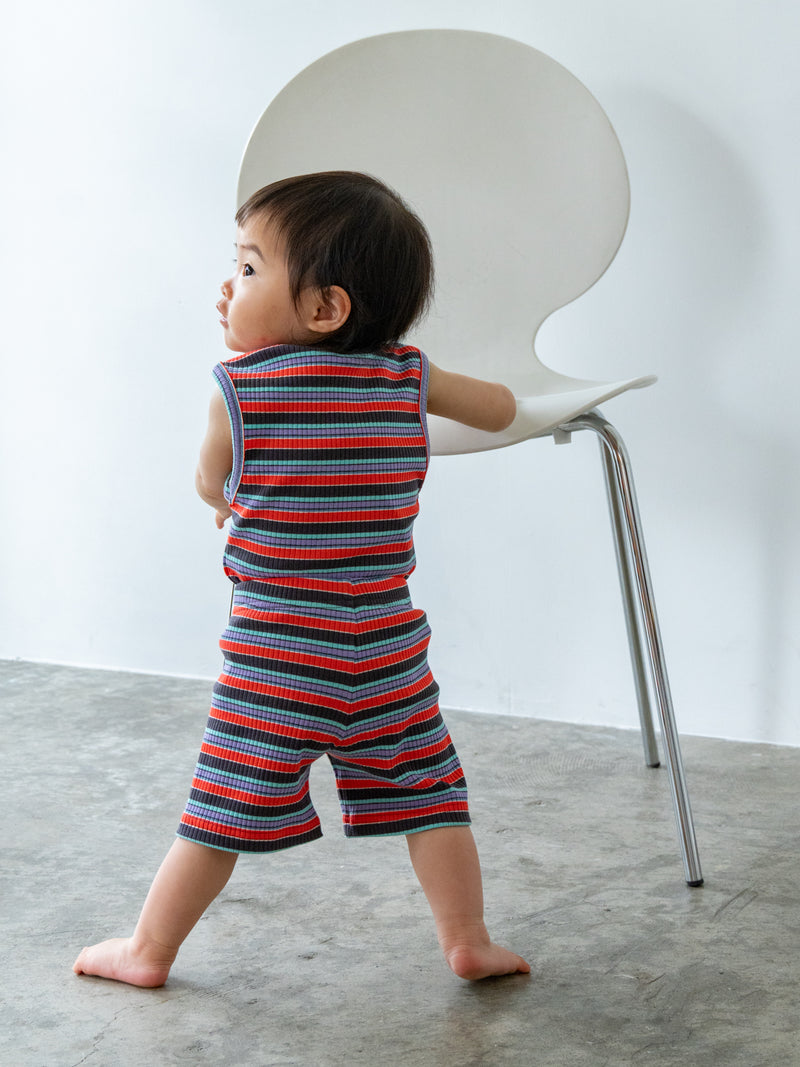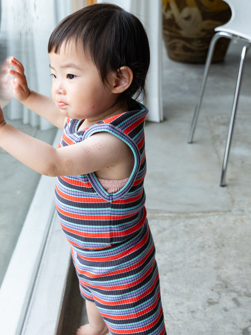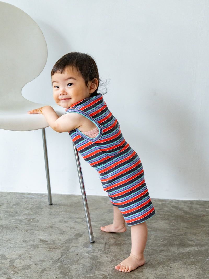 明るくポップな配色が目を引く、マルチストライプ柄のノースリーブトップス。夏らしい軽やかなデザインで、コーディネートの主役になる一枚です。