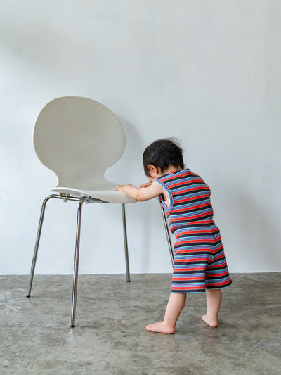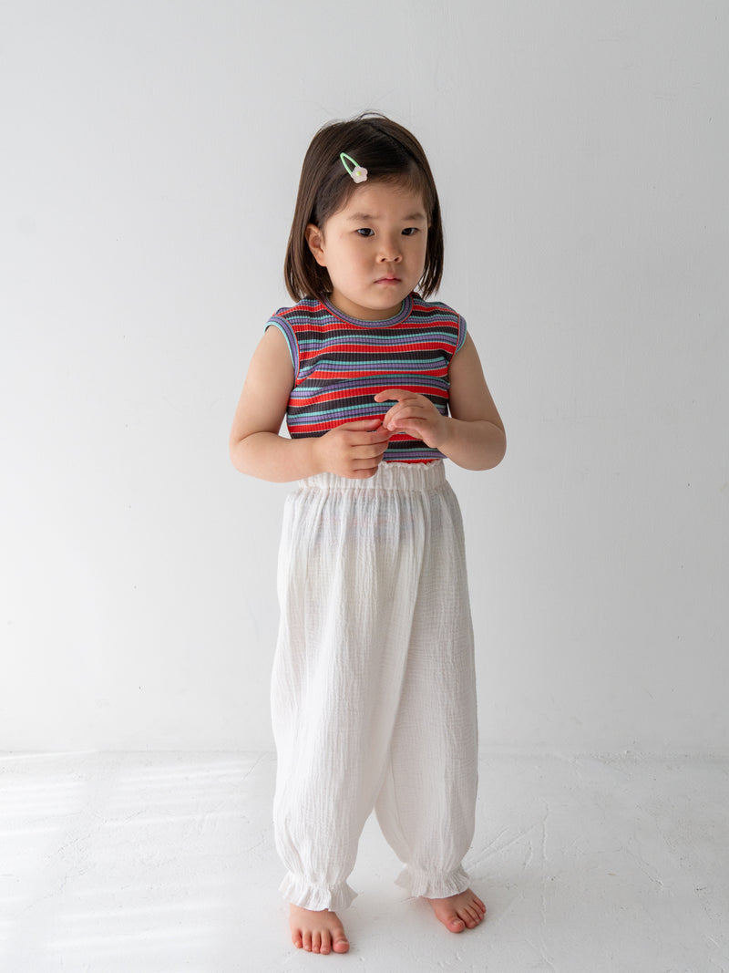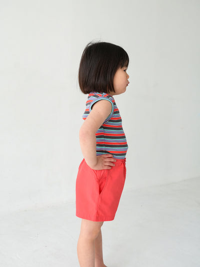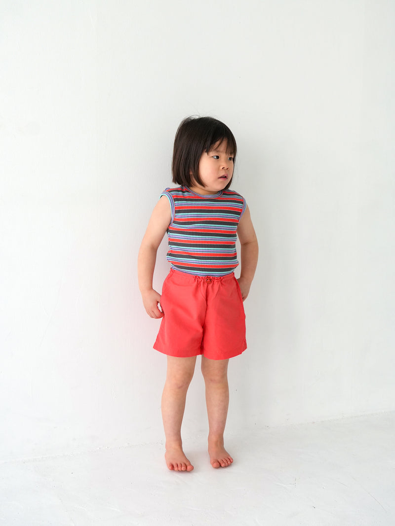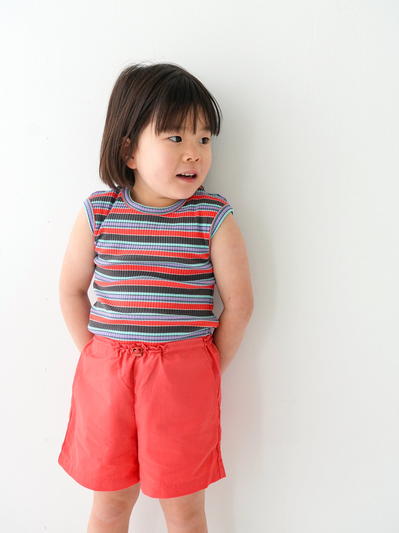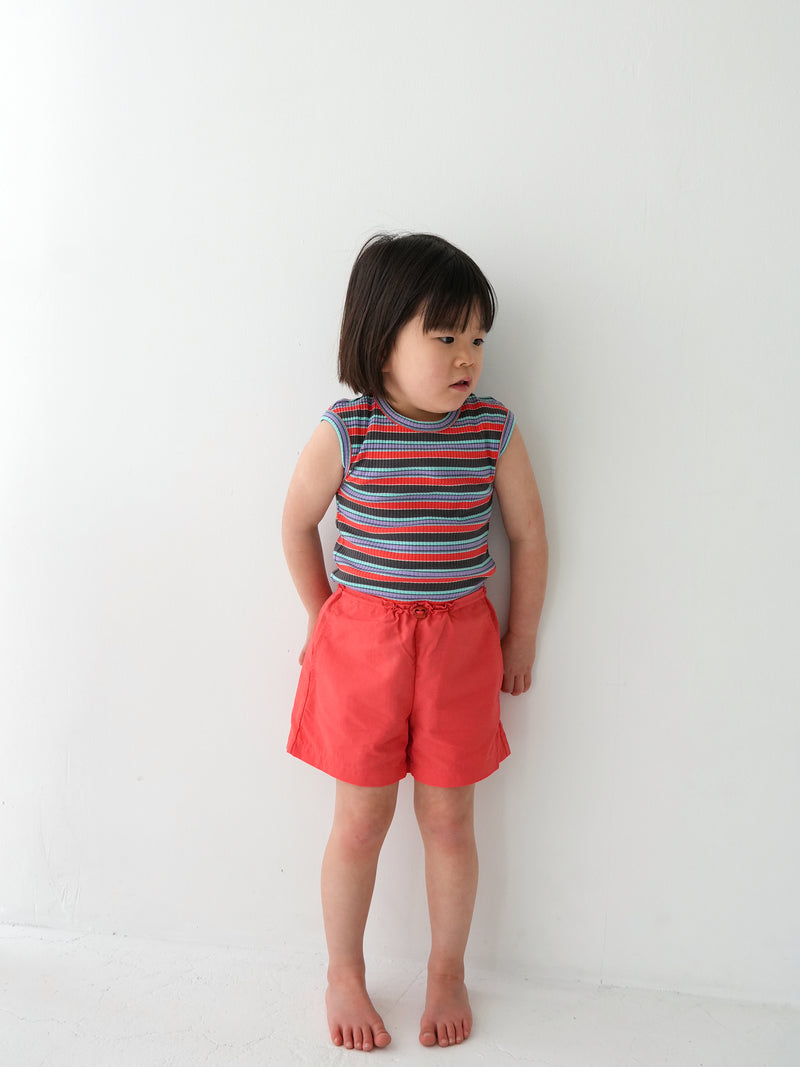 明るくポップな配色が目を引く、マルチストライプ柄のノースリーブトップス。夏らしい軽やかなデザインで、コーディネートの主役になる一枚です。