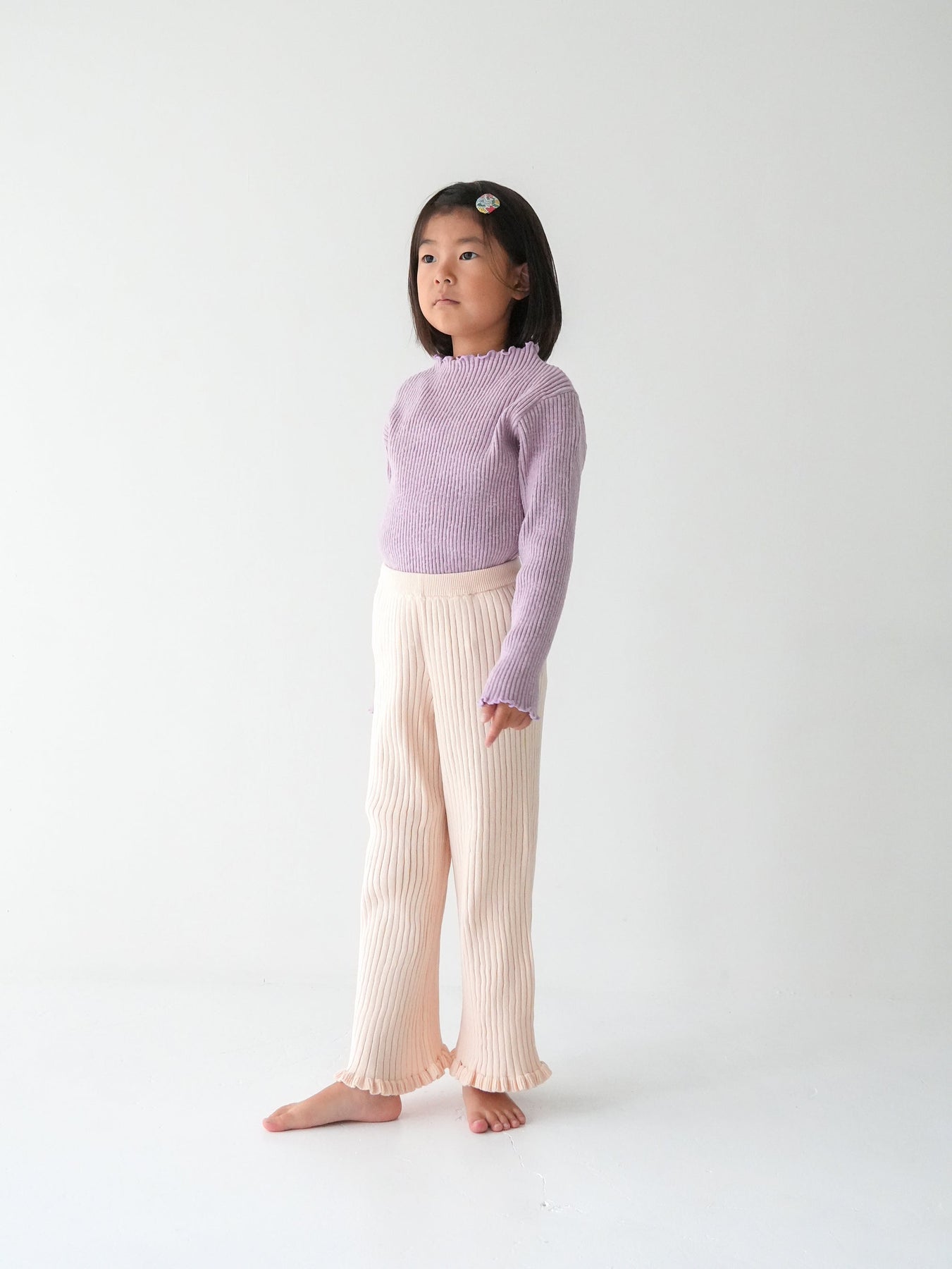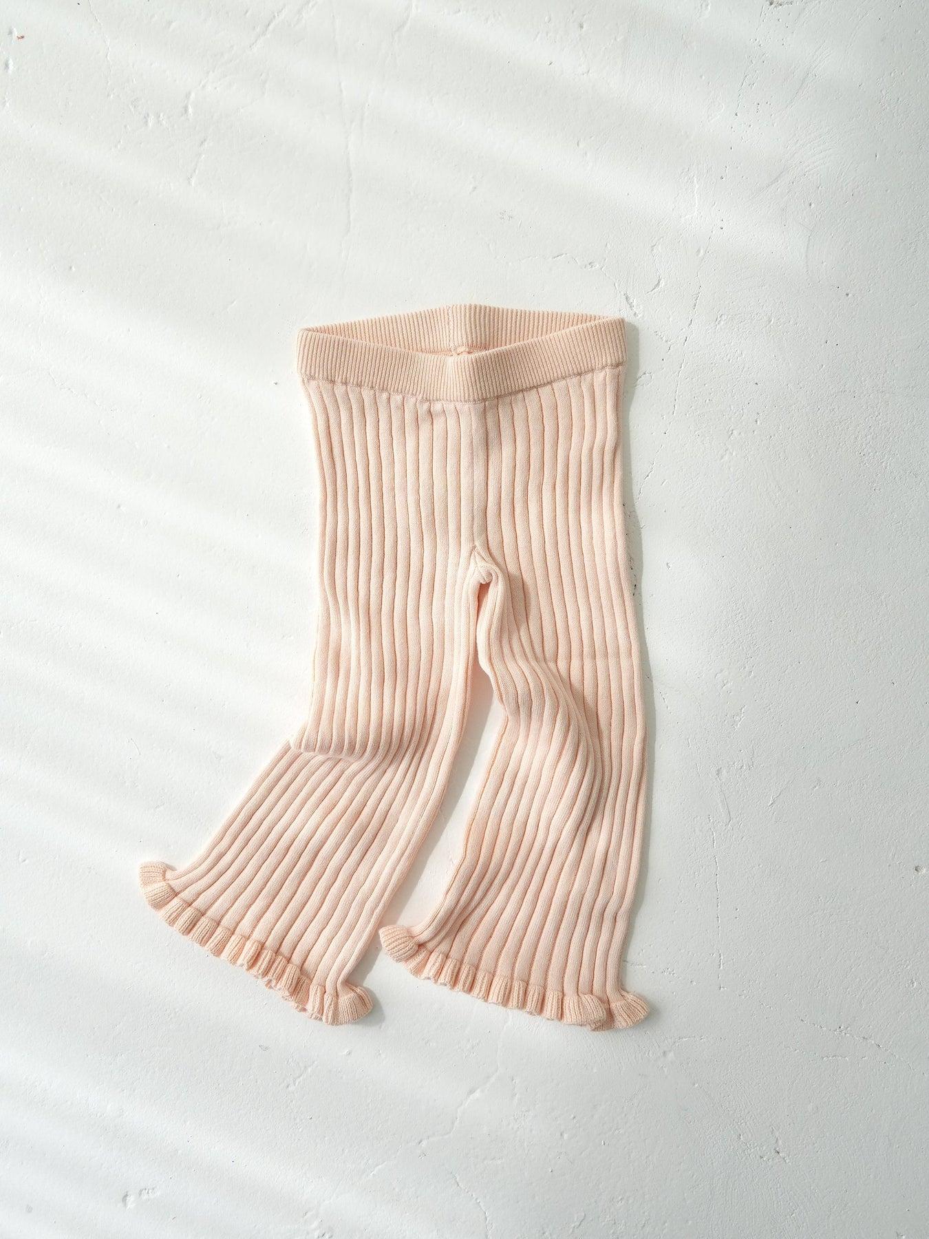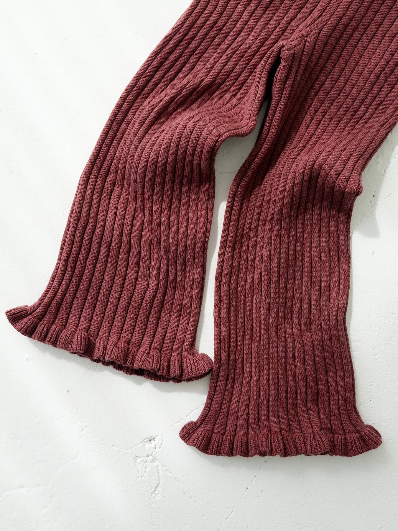 裾のフリルディテールがさりげなく可愛らしいアクセントになった、リブニットのロングパンツ。
