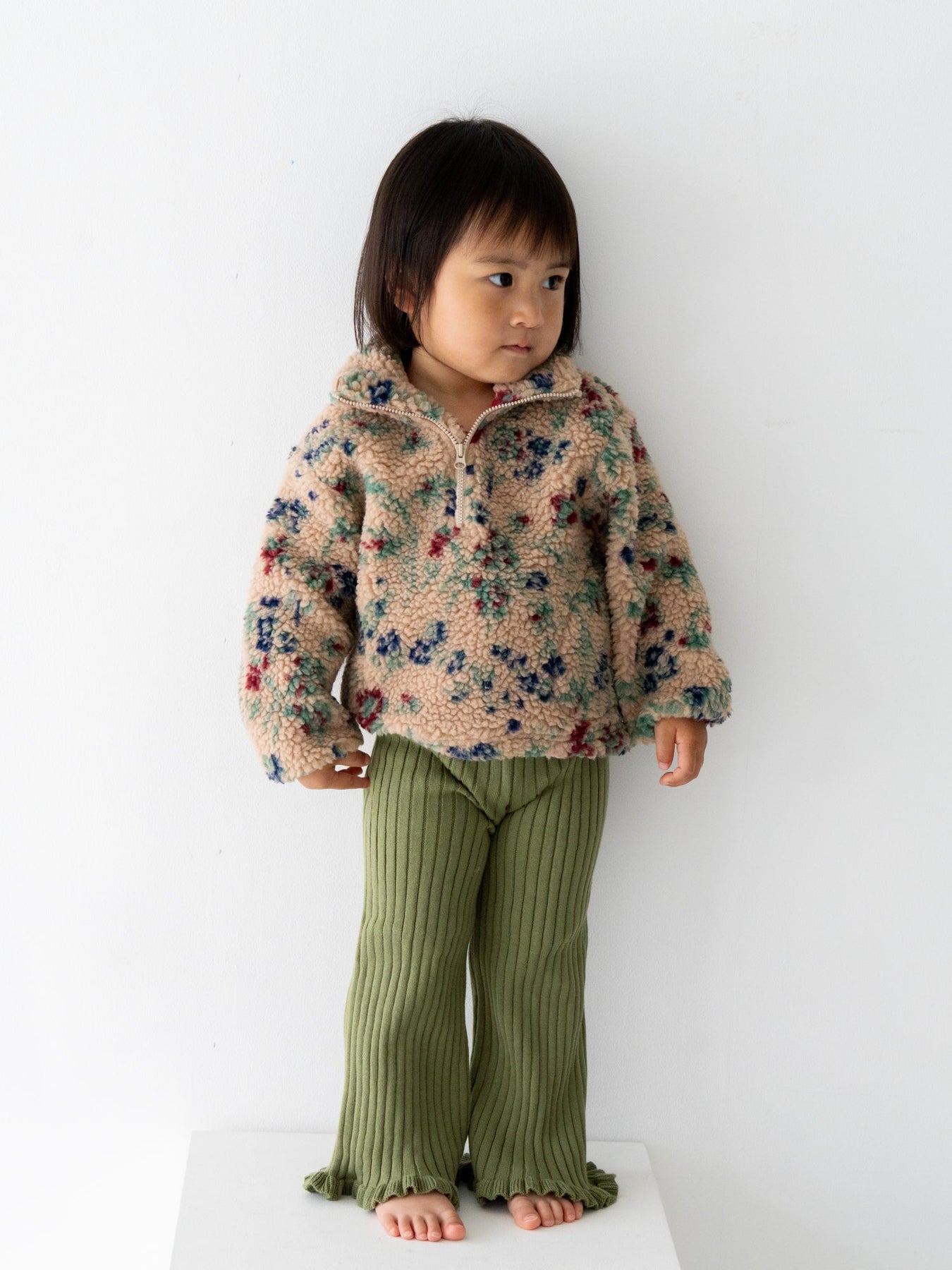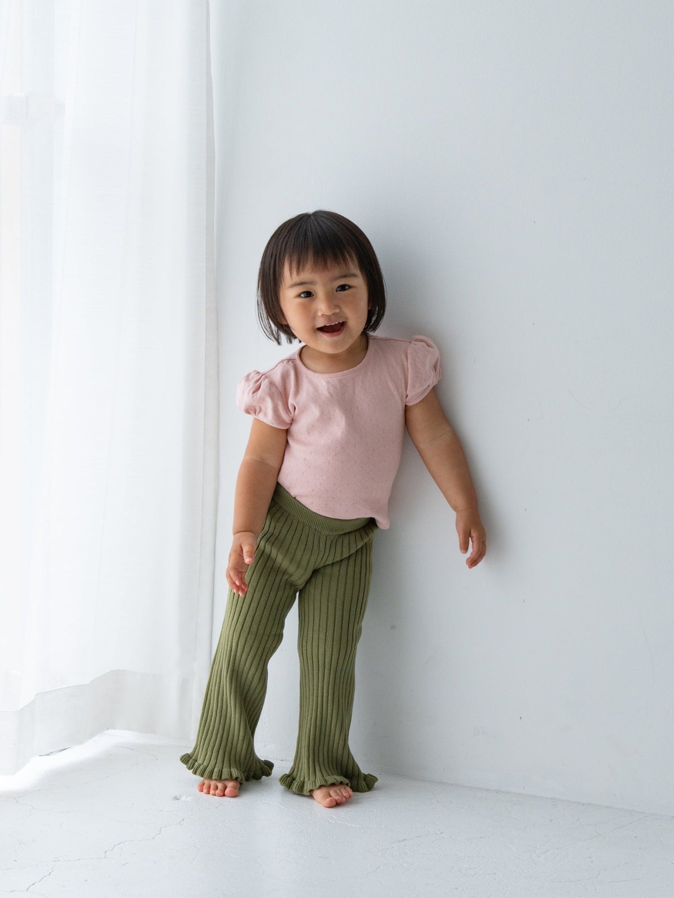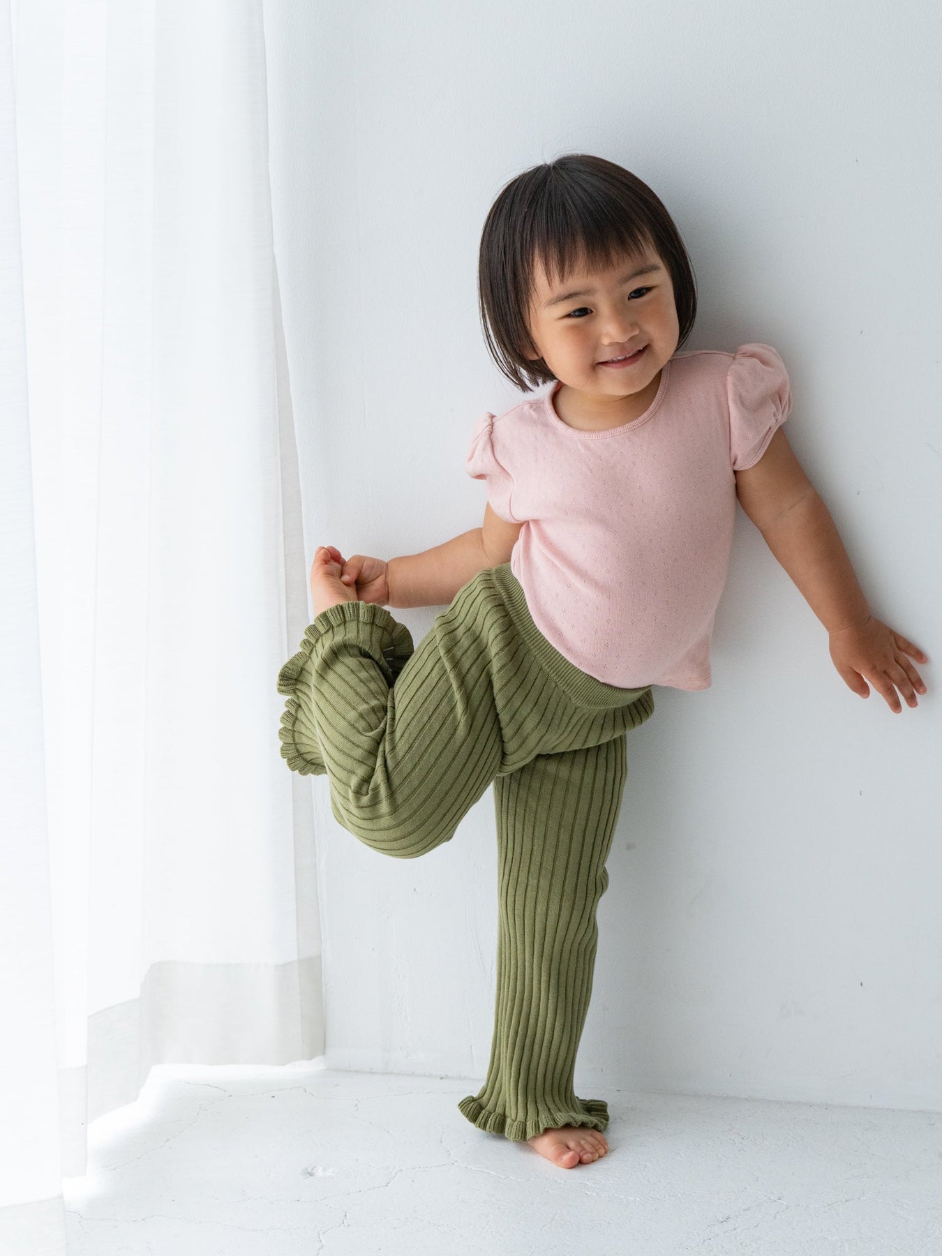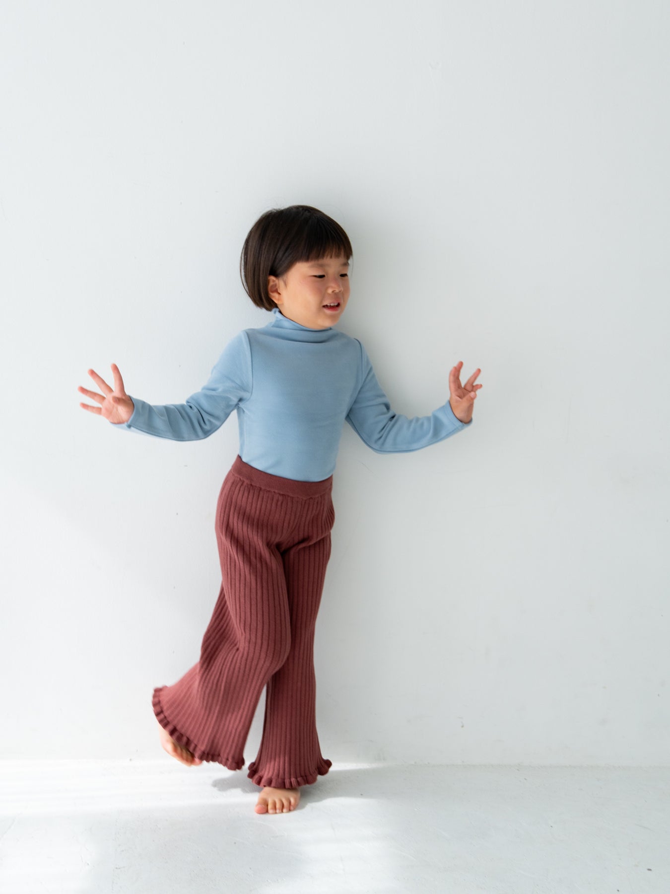 裾のフリルディテールがさりげなく可愛らしいアクセントになった、リブニットのロングパンツ。