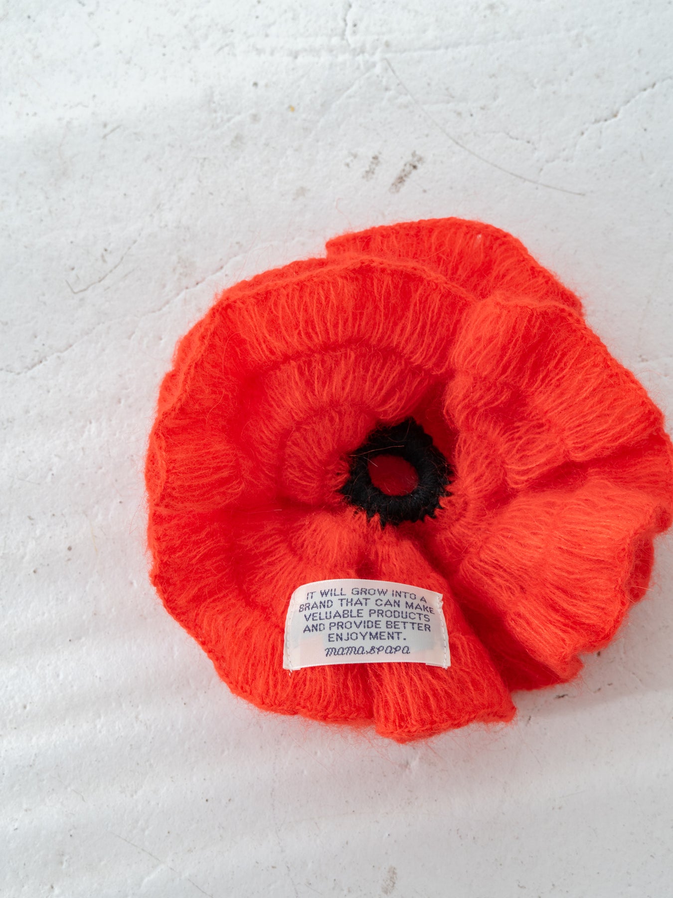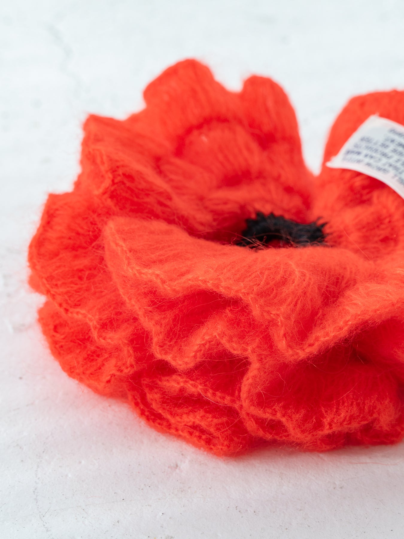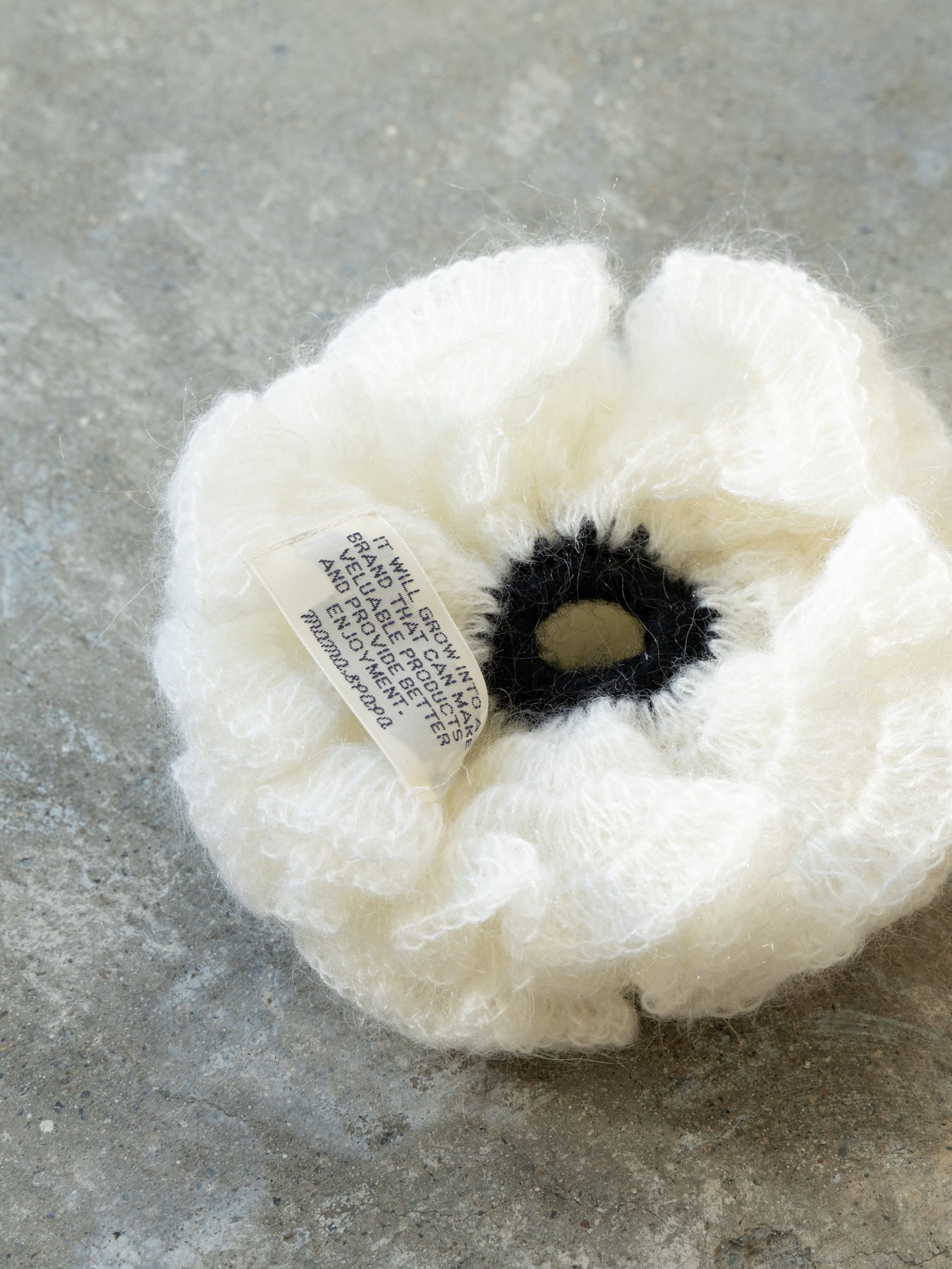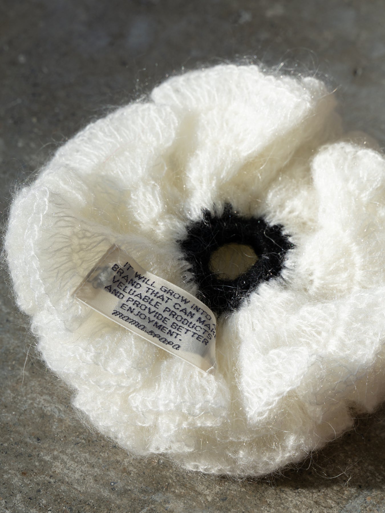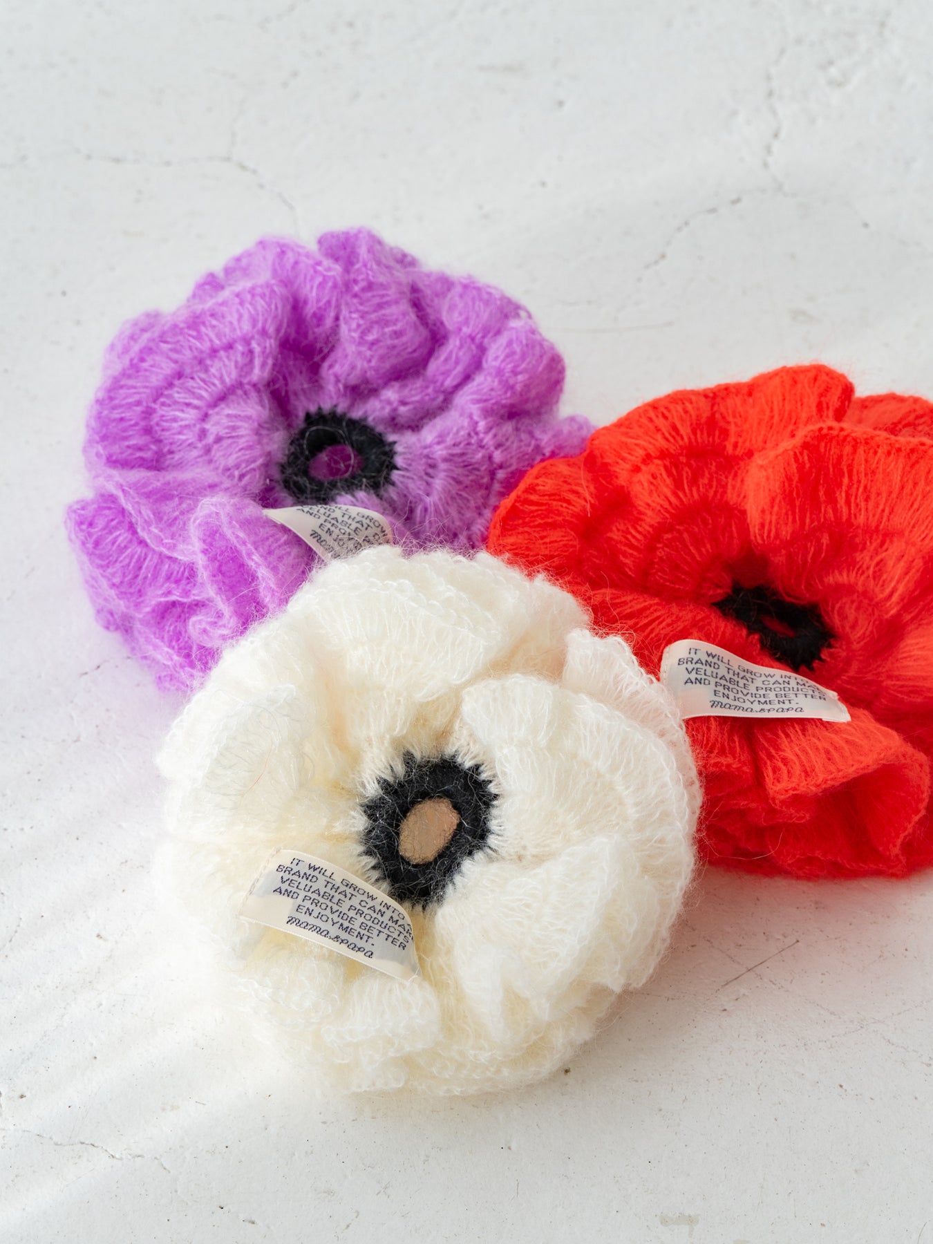 ふんわりとした毛糸で立体的に編み上げたお花のようなニットシュシュ。