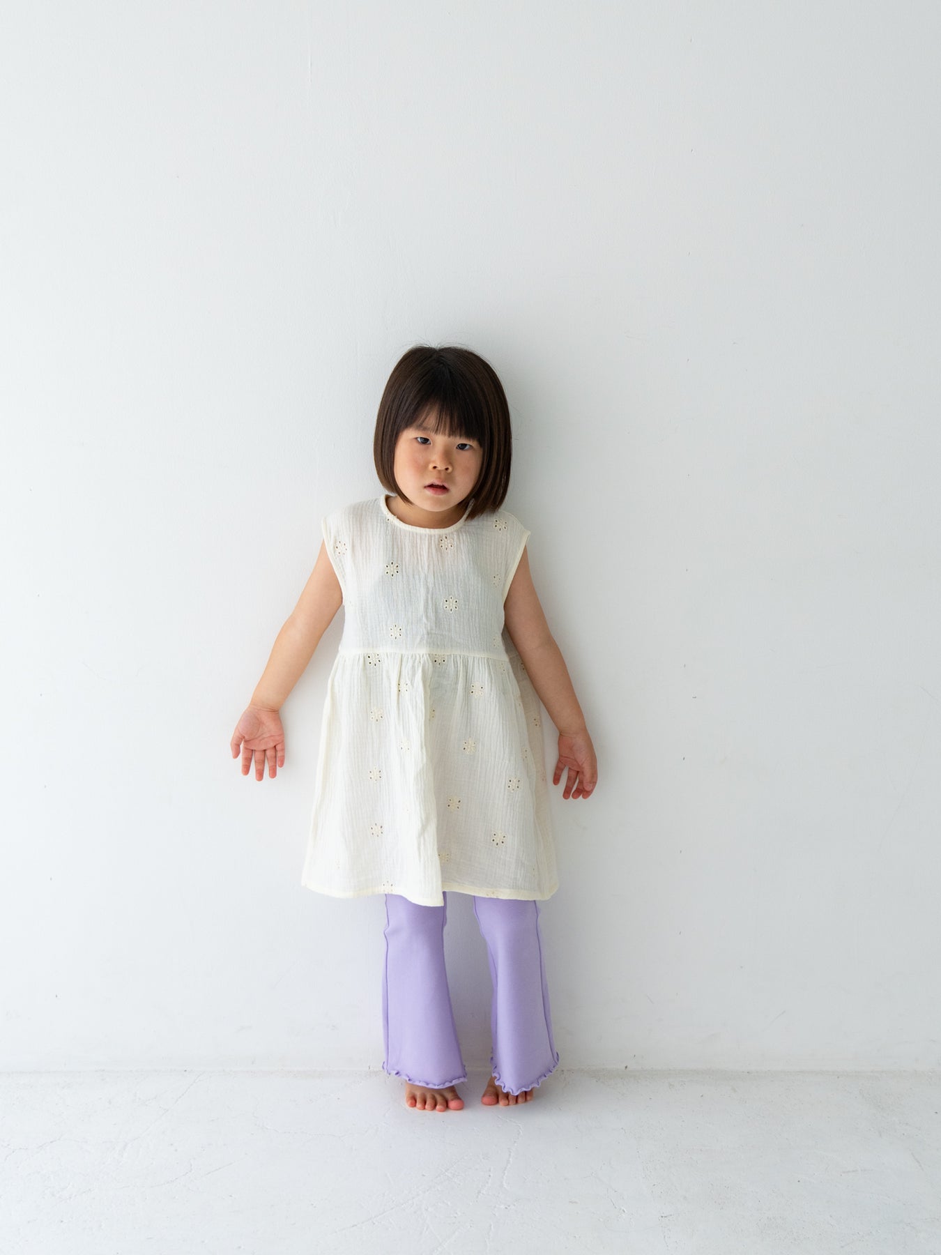 Flowerカットワークがさりげないアクセントになった、コットン100%のクレープ素材のドレス。