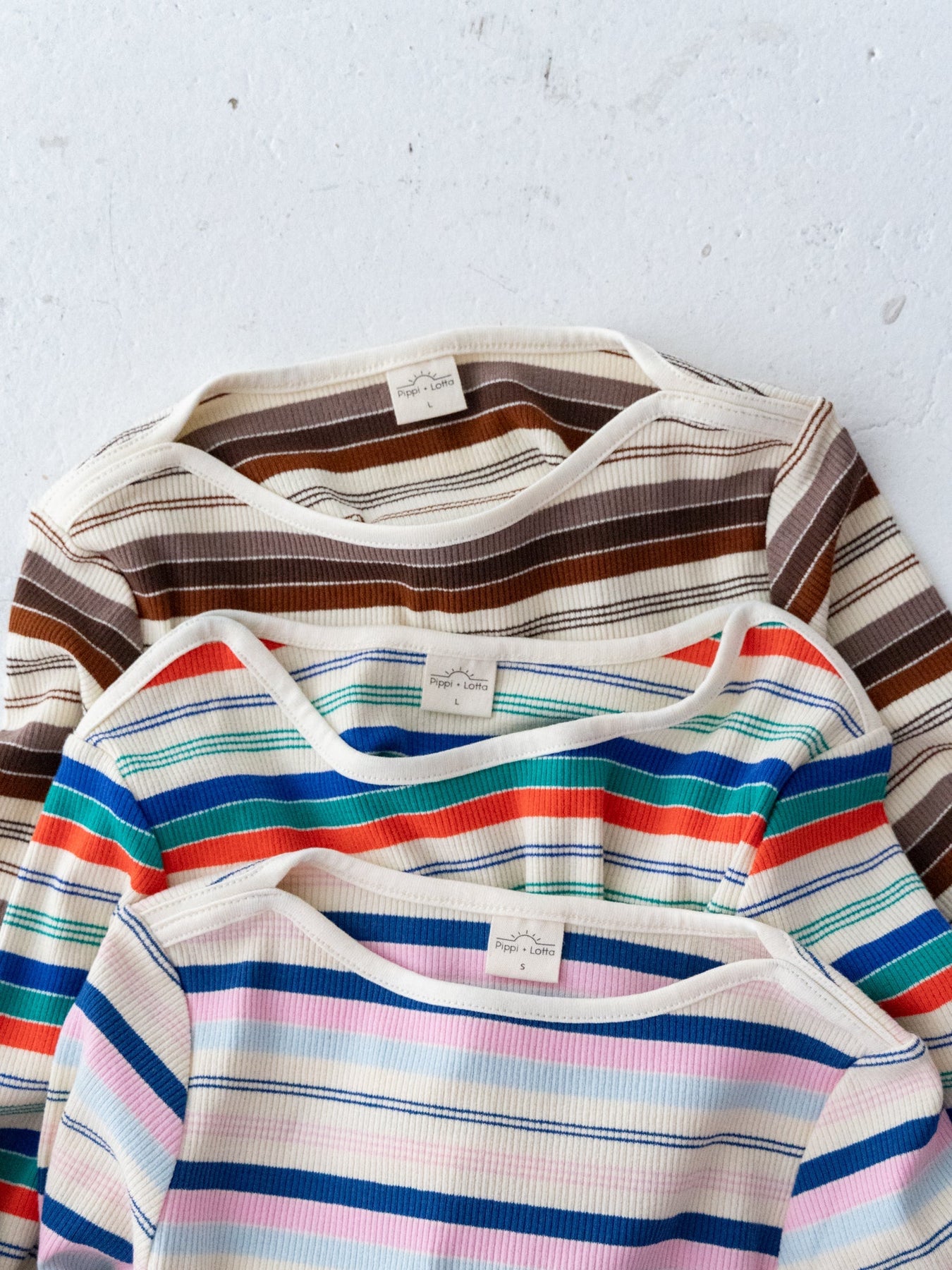 綿100%のコットンリブ素材を使用した、肌ざわりやわらかなロングスリーブカットソー。首元はすっきりとしたボートネックデザインで、シンプルながら上品な印象に。